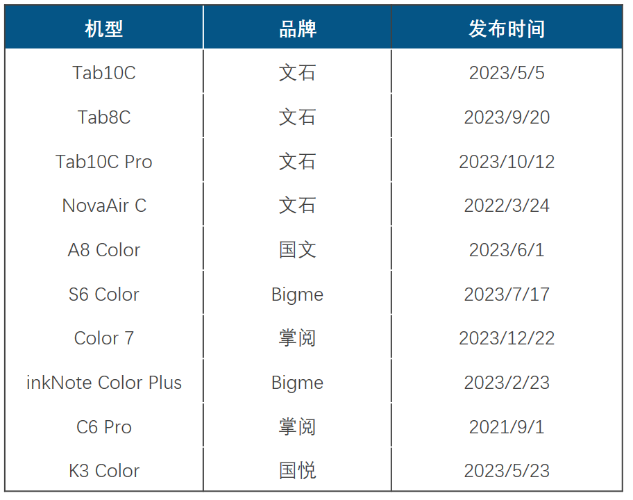 從產品數量上來看,Bigme發布的彩色電子紙平板數量最多,達到12款。文石共計發布了6款彩色電子紙產品,覆蓋6寸、7寸、7.8寸、10.3寸等主流尺寸。