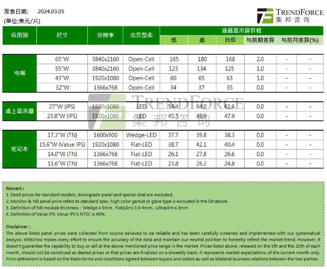 3月5日,TrendForce 公布3 月上旬面板報價,TrendForce 研究副總范博毓指出,電視面板需求到3 月后明顯增強,平均產能稼動率有望回升至80% 以上,也增強面板廠漲價信心。