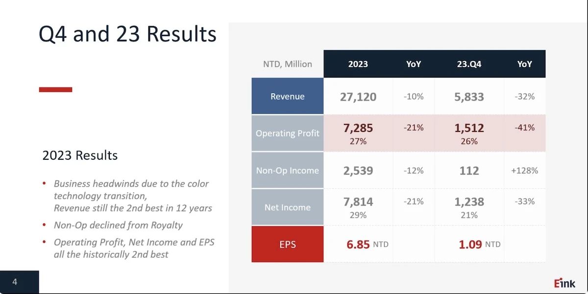 3月7日,元太法說會說明2023 年第四季暨全年業績,第四季合并營收58.33 億元、年減32%,歸屬于公司稅后凈利12.38 億元、年減33%,稅后每股盈余1.09 元。全年合并營收271.2 億元、年減10%,歸屬于公司稅后凈利78.14 億元、年減21%,稅后每股盈余6.85 元,全年營業利益、凈利、每股盈余都創公司歷年次高。元太董事會日前通過股利政策,維持去年相同水準,每股配息4.5 元、配息率66%。