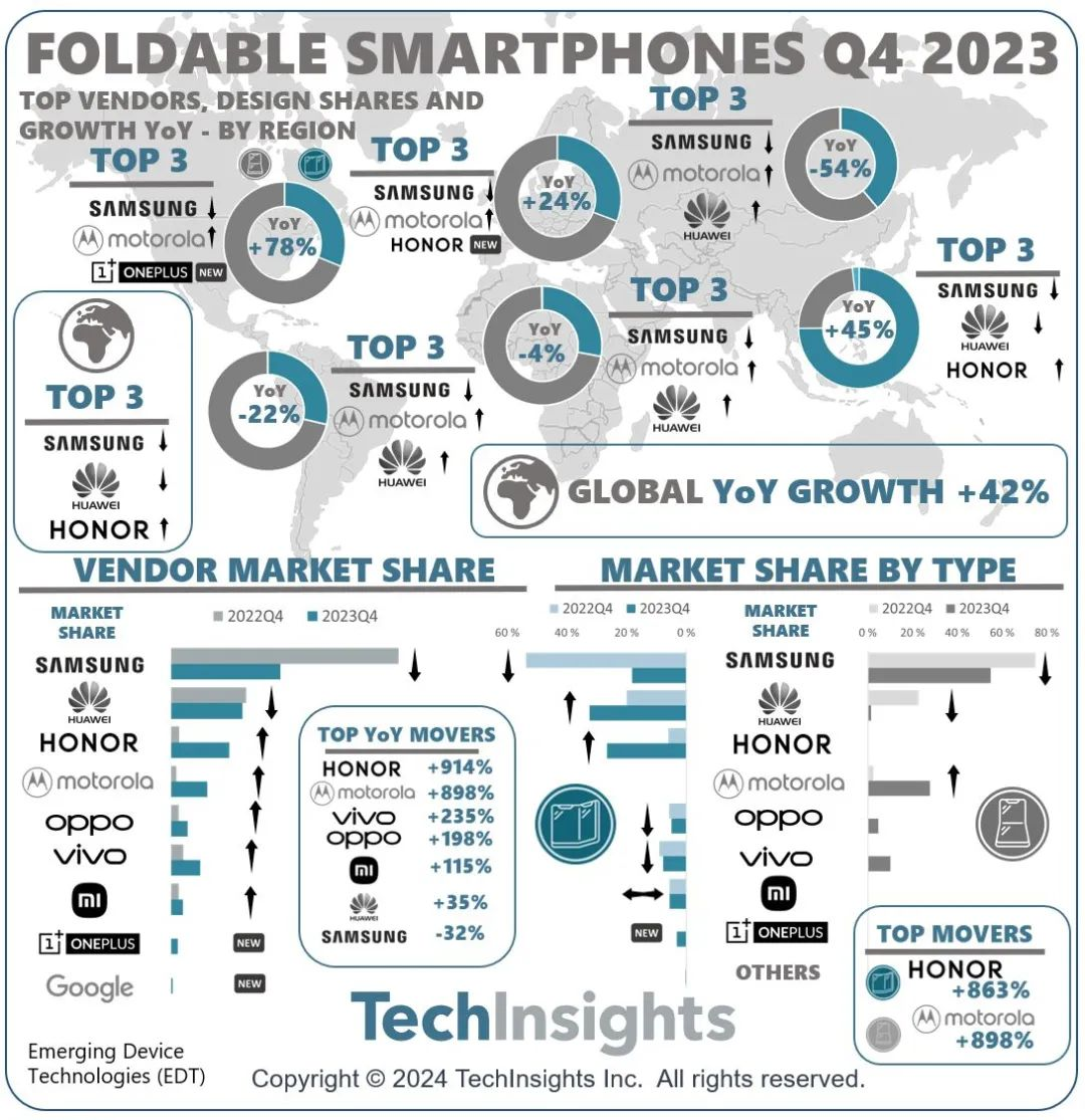 研究機構(gòu)TechInsights最新數(shù)據(jù)顯示,2023年第四季度全球折疊屏手機市場規(guī)模同比增長42%,但由于地緣政治、經(jīng)濟動蕩以及三星的疲軟,北美和西歐的主要市場大幅下滑;亞太地區(qū)是該季度折疊屏手機出貨量增長的領(lǐng)導(dǎo)者,三星、華為、榮耀位列前三。