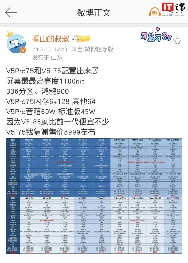 3 月 13 日消息,博主 @看山的叔叔 今日爆料了華為智慧屏 V5 Pro 75 和 V5 75 的具體配置參數,并預測華為智慧屏 V5 75 的售價在 8999 元左右。
