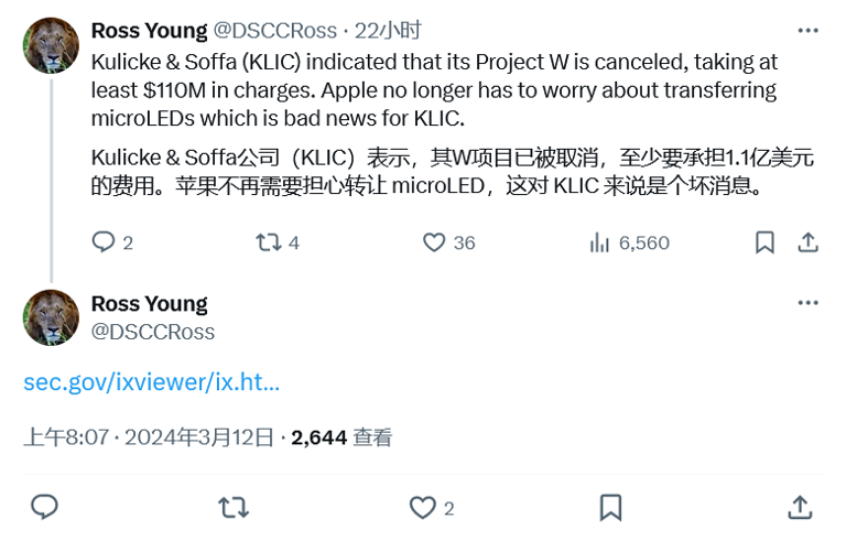 2月底,蘋果供應商歐司朗(ams OSRAM)宣布由于某重要項目遭意外取消,歐司朗表示,經初步評估,公司預計2024年第一季對Micro LED相關資產進行6-9億歐元的資產減損,并重新評估Micro LED戰略。