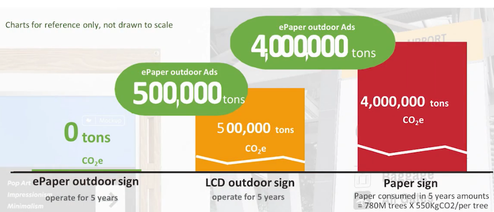 E Ink元太科技公司曾經(jīng)以32英寸的紙質(zhì)廣告、液晶屏幕和電子紙顯示屏對戶外數(shù)字標牌的碳排放影響為例進行了比較測算。如果有10萬個電子紙廣告牌每天運行20小時,每小時更新廣告20次,并持續(xù)5年,與液晶屏相比,使用電子紙屏將減少約50萬噸CO2排放量。與只使用一次即丟棄的傳統(tǒng)紙質(zhì)海報相比,使用電子紙屏可將CO2排放量減少約400萬噸。