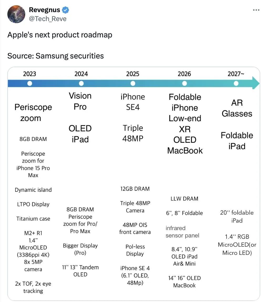 近日,知名爆料人士Tech_Reve在X平臺賬號恢復(fù)更新后,披露了一張據(jù)稱來自“三星安全部門”的蘋果產(chǎn)品路線圖。雖然已開售的Vision Pro頭顯以及即將發(fā)布的OLED iPad Pro并不在內(nèi),但我們整理了路線圖中2025年及以后的產(chǎn)品如下: