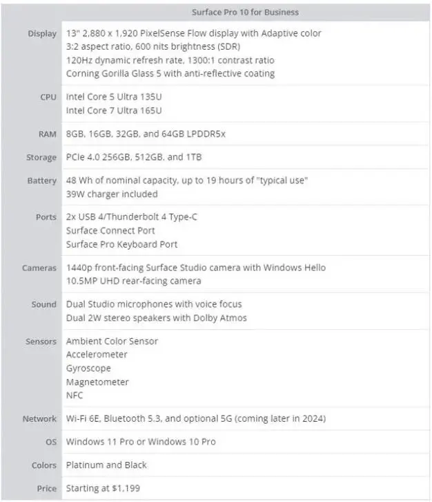 具體配置上,Surface Pro 10 商用版可選英特爾酷睿 Ultra 5 135U 或 Ultra 7 165U 處理器,同時支持 5G 連接,這也是微軟首次為英特爾平臺引入 5G 功能。
