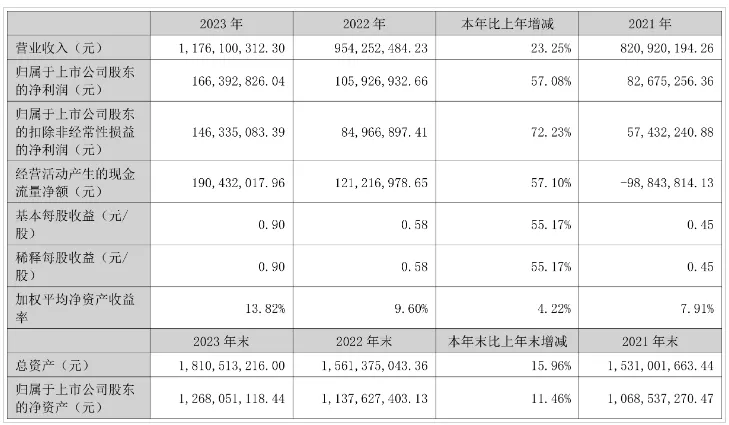 3月26日,芯瑞達(dá)(002983)發(fā)布2023年年度報(bào)告,報(bào)告期內(nèi)公司實(shí)現(xiàn)營(yíng)業(yè)收入1,176,100,312.30元,同比增長(zhǎng)23.25%;歸屬于上市公司股東的凈利潤(rùn)166,392,826.04元,同比增長(zhǎng)57.08%。