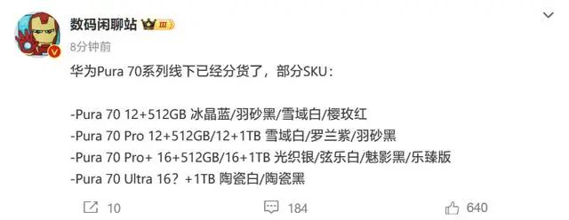 博主 @數碼閑聊站 剛剛也發文稱,華為 Pura 70 系列線下已經發貨了,并列出了部分 SKU: