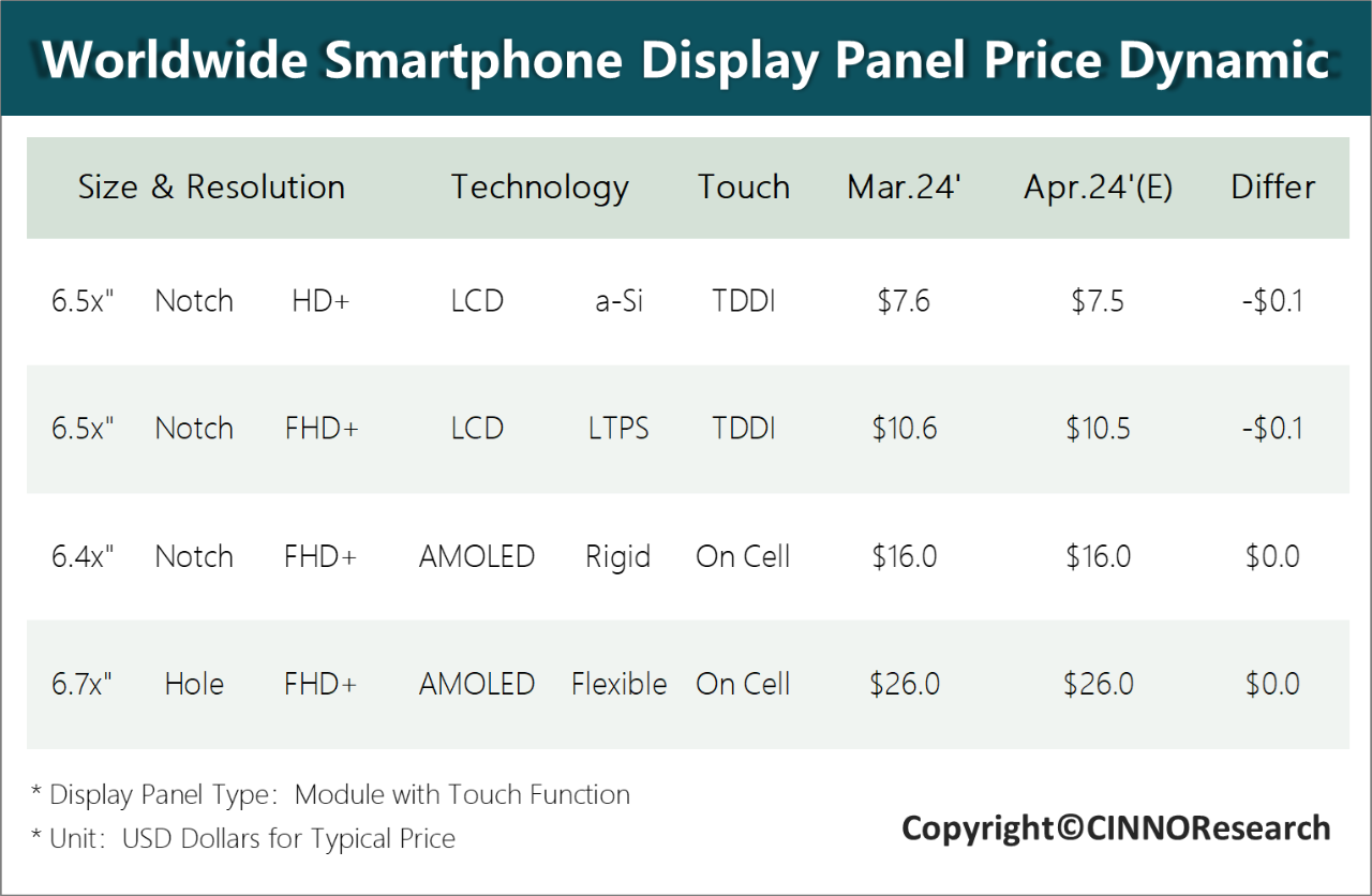 CINNO Research預測,4月和5月手機面板價格呈現“分化”趨勢,LCD需求持續減弱,價格將以每月0.1美金的速度下滑;剛性AMOLED面板價格或將短期企穩;柔性AMOLED面板價格將小幅上漲。