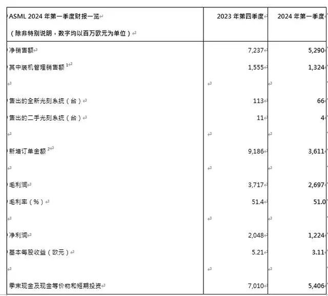 4月17日,荷蘭光刻機公司阿斯麥(ASML)發(fā)布2024年第一季度財報。財報數(shù)據(jù)顯示,2024年第一季度,ASML實現(xiàn)凈銷售額53億歐元,環(huán)比下降27%,毛利率為51.0%,凈利潤為12億歐元,環(huán)比下降40%。