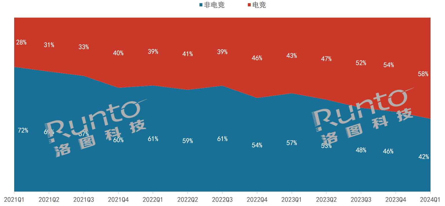 在之前發(fā)布的《2024年第一季度中國顯示器線上市場季度報告》一文中提到,電競顯示器在當(dāng)季占到了獨立顯示器整體線上市場的58%,滲透率創(chuàng)季度歷史新高。三年以來,電競在整體市場的占比剛好翻了一番。