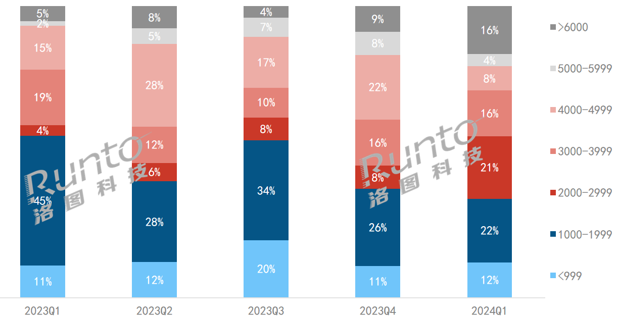 2023-2024Q1 中國(guó)學(xué)習(xí)平板線上市場(chǎng)價(jià)格段銷量結(jié)構(gòu)