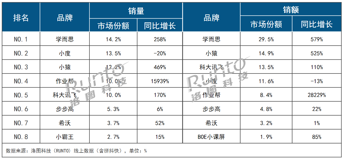 小猿在銷額方面排名第二,銷量排名第三,其單一爆品“學(xué)練機(jī)”在第一季度的暢銷機(jī)型中位列榜首。