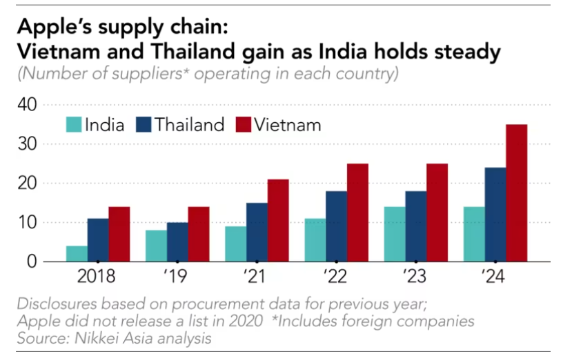 2023年,在越南運營的蘋果供應商數量激增40%,達到35家,而在泰國的供應商數量增長約三分之一,達到24家。印度的供應商數量保持在14家,當地企業塔塔集團(Tata Group)首次進入蘋果供應商名單。塔塔集團從中國臺灣的緯創資通收購了班加羅爾的一家iPhone組裝廠后,為蘋果供應iPhone外殼,其在供應鏈中的地位有望進一步提高。