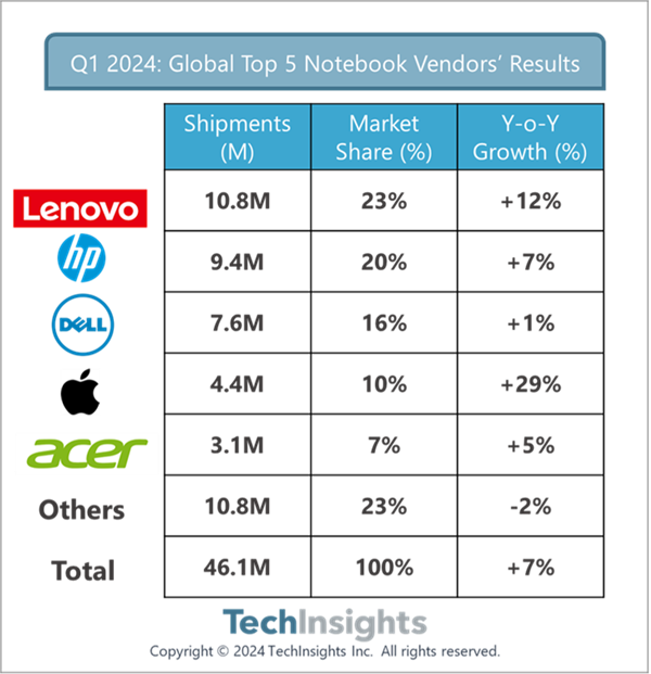 4月29日消息,市場研究機構 TechInsights今天發(fā)布的最新報告顯示,2024年第一季度,全球筆記本電腦出貨量同比增長7%,達到4610萬臺。