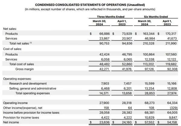 在截至2024年3月30日的第二財(cái)季,蘋果公司的凈利潤(rùn)為236.36億美元,與去年同期的241.60億美元相比下降2%;每股攤薄收益為1.53美元,與去年同期的1.52美元相比略有增長(zhǎng)。蘋果公司第二財(cái)季用于計(jì)算每股收益的在外流通股票總量為15464709股,而去年同期為15847050股。
