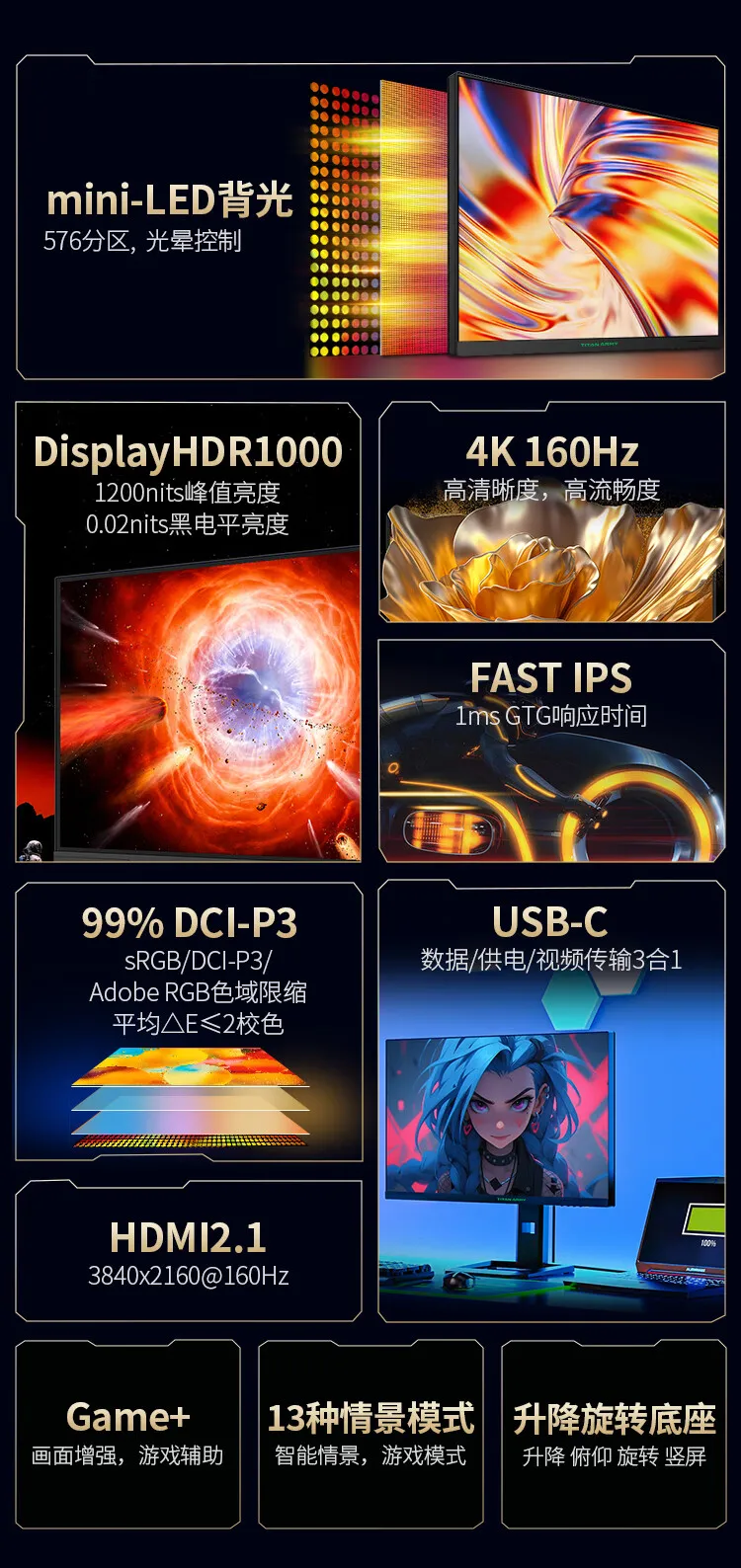 HDR支持:支持HDR1000,展現出更廣闊的色域和更高的對比度,帶來更具層次感的視覺效果。