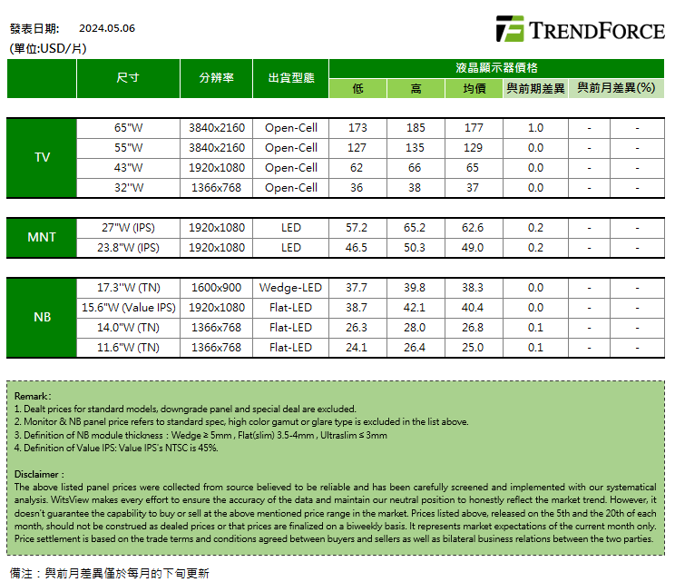 集邦科技(TrendForce)6日公布5月上旬面板報(bào)價(jià),TrendForce研究副總范博毓表示,電視面板備貨動(dòng)能放緩,大尺寸電視面板價(jià)格續(xù)漲,但中尺寸以下電視面板呈現(xiàn)漲不動(dòng)的疲軟走勢。但I(xiàn)T用面板可望接續(xù)起漲,又以監(jiān)視器的品牌客戶需求最為強(qiáng)勁。
