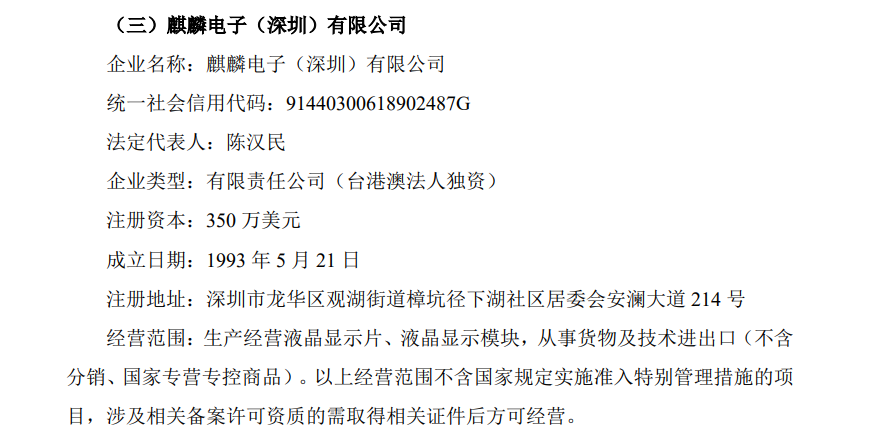 據(jù)公告顯示,麒麟電子(深圳)有限公司位于深圳市龍華區(qū),主要是生產(chǎn)經(jīng)營液晶顯示片、液晶顯示模塊,從事貨物及技術進出口(不含 分銷、國家專營??厣唐罚?。