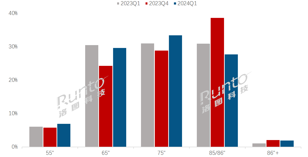 根據(jù)洛圖科技(RUNTO)數(shù)據(jù)顯示,2024年第一季度,65寸、75寸、86寸三個(gè)尺寸的產(chǎn)品占整體市場的九成以上,達(dá)90.4%。