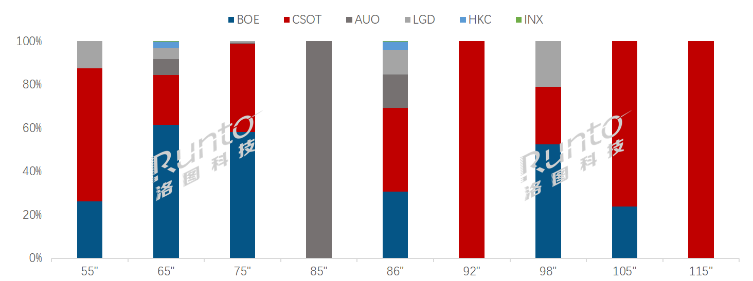 CSOT在 55寸、86寸、105寸方面出貨量位居第一,市占分別是61.2%、38.6%、76.2%;75寸產(chǎn)品的出貨量僅次于BOE,市占40.7%。本季度開始供應(yīng)92寸、115寸產(chǎn)品。