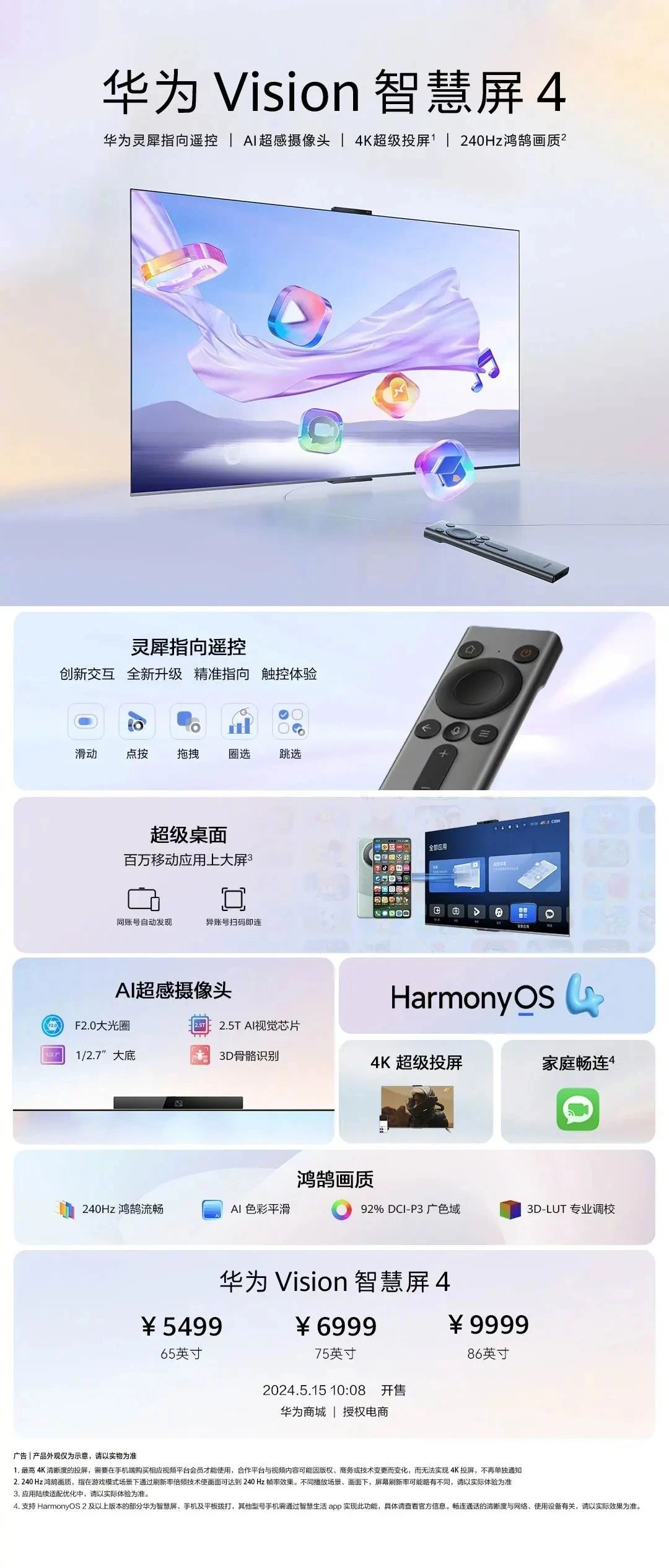華為 Vision 智慧屏 4 提供 65、75、86 英寸三種尺寸,售價(jià)分別為 5499 元、6999 元、9999 元,預(yù)售到手價(jià)分別為 4999 元、6499 元、8999 元。