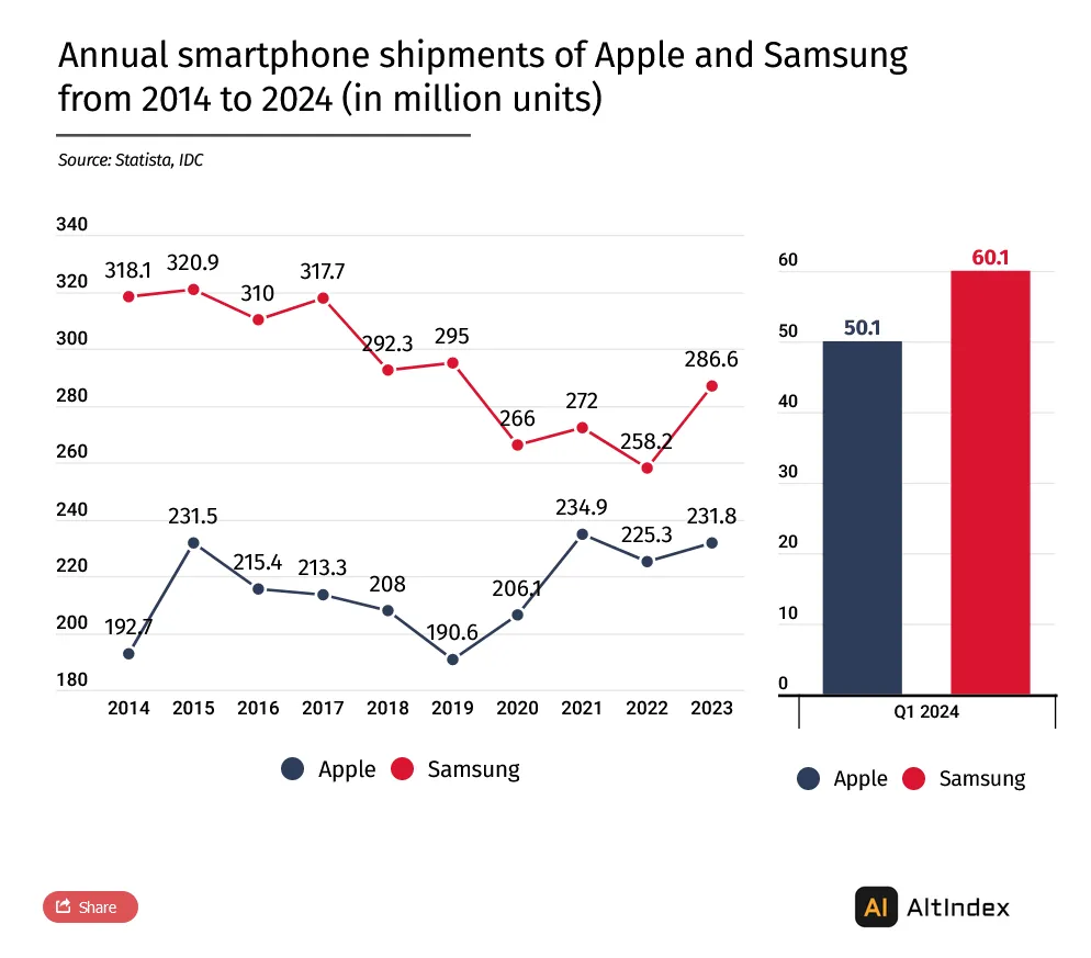 5 月 17 日消息,數據投資分析平臺 AltIndex 近日基于 IDC 公布的數據,表示 2014-2024 過去 10 年期間,三星智能手機的出貨量接近 30 億臺,比蘋果多出 7 億臺,高出 33%。