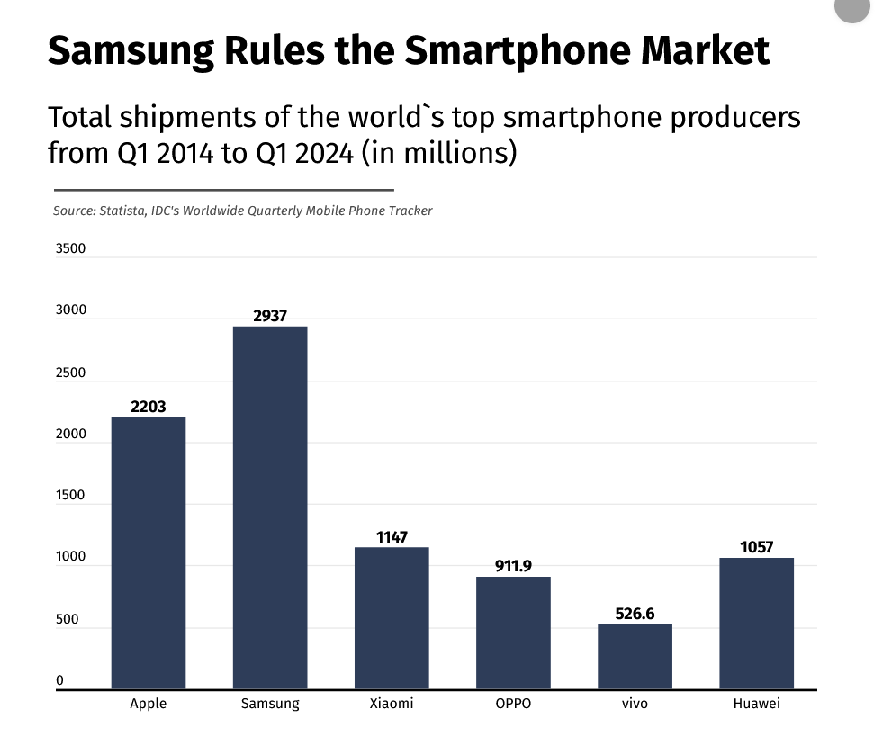 根據 IDC 的全球季度手機追蹤調查,三星在過去十年中的智能手機出貨量接近 30 億部,比蘋果高出 33%。