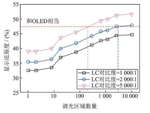 具體而言,OLED技術(shù)的高對比度源于其像素級別的調(diào)光技術(shù),也就是具有足夠多的調(diào)光區(qū)域,LCD的對比度由LC層和背光調(diào)光設(shè)計共同決定。為了達到與OLED相同的表現(xiàn),當LC層的對比度達到5000:1時,需要200個調(diào)光區(qū)域;當LC層達到對比度2000:1時,需要3000個調(diào)光區(qū)域。傳統(tǒng)的LED背光不能分出足夠的可控區(qū)域,如果采用Mini-LED背光技術(shù),就可以達到需要的控制精度要求。