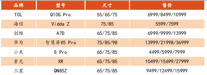 Mini-LED背光TV到達價格甜蜜點,預(yù)計滲透將加速。目前,大部分品牌的Mini-LED背光電視價格普遍降價至1萬元以下,雖然仍為普通LCD電視價格兩倍以上,但是已經(jīng)進入普通消費者可接受的價格范圍。Mini-LED電視相比LCD可以獲得更佳使用體驗,而OLED電視價格普遍還在2萬元以上,如果消費者需要選擇一款高端電視,則Mini-LED會成為消費者的首選。