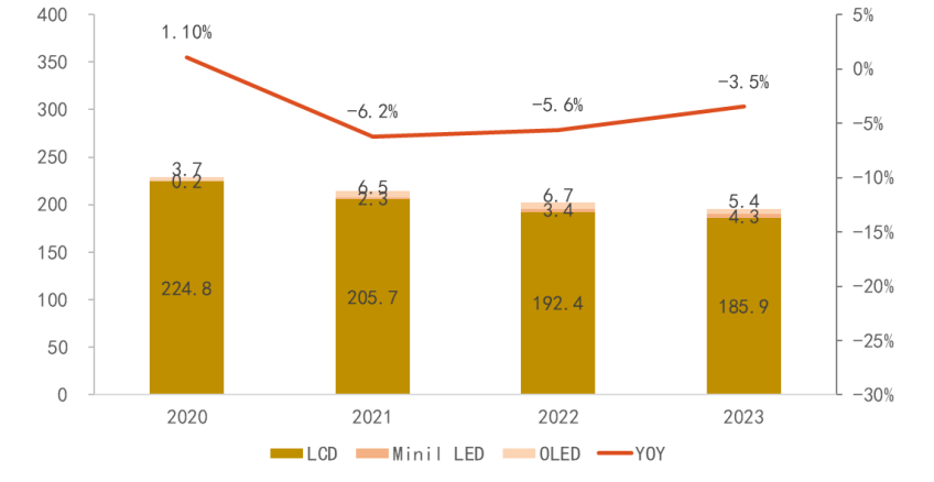 全球TV出貨量下降,Mini-LED逆勢增長。根據(jù)奧維睿沃統(tǒng)計,2023年全球TV出貨量為1.96億臺,同比下降3.5%,OLED電視出貨量540萬臺,下降了19.4%。根據(jù)洛圖科數(shù)據(jù),Mini-LED電視2023年出貨量為430萬臺,同比增加24.6%,預(yù)計2024年Mini-LED電視出貨量將反超OLED電視。在電視市場小幅萎縮的情況下,Mini-LED電視實現(xiàn)逆勢大幅增長,尤其是在中高端滲透較快,預(yù)計會成為TV廠商重點競爭領(lǐng)域。