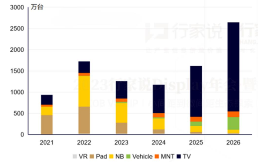 Mini-LED背光與上一代LCD顯示一脈相承,電視為主要增量。LCD經(jīng)過多年的市場拓展,在電視、電腦等領(lǐng)域應(yīng)用廣泛,由于Mini-LED背光與LCD背光技術(shù)原理一致,可以很好利用LCD的產(chǎn)業(yè)鏈和市場渠道推廣。根據(jù)行家說《2023Mini-LED背光調(diào)研白皮書》中成果,2023年,Mini-LED背光產(chǎn)品整體出貨量約為1259萬臺,Mini-LED背光TV板塊同比增長近50%,預(yù)計2024-2026年TV將保持增長,成為Mini-LED背光最主要的拉動力量。