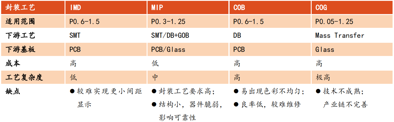 圖:主流直顯封裝技術(shù)路線優(yōu)缺點對比