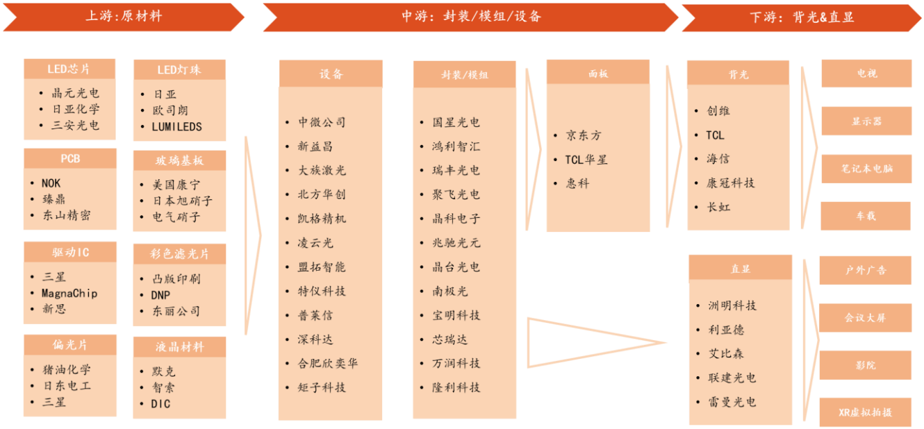 Mini-LED背光和直顯產(chǎn)業(yè)鏈相似,上游原材料包括LED芯片、燈珠、PCB、玻璃基板、驅(qū)動IC等;Mini-LED直顯使用RGB三色芯片可以作為像素點直接顯示圖像,Mini-LED背光本質(zhì)是仍是液晶顯示,Mini-LED作為外部光源后通過濾色片顯示顏色,因此在中游環(huán)節(jié)直顯相比背光省去了背光模組和液晶面板環(huán)節(jié);在下游環(huán)節(jié),背光目前主要應(yīng)用在電視、顯示屏等領(lǐng)域,直顯主要應(yīng)用在戶外廣告、會議大屏等領(lǐng)域。