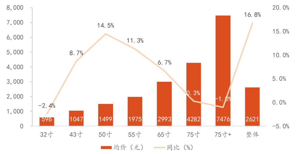 圖:2024 年 2 月中國彩電線上市場分尺寸均價及同比