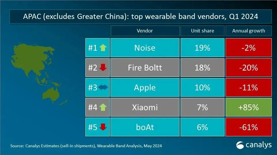 如果把目光放大到亞太地區,那么印度智能手表巨頭 Noise、Fire Boltt 牢牢占據了前兩名的地位,而蘋果、小米以及 boAt(印度)則分列三四五名。