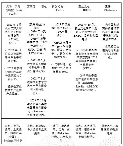 為應對價格暴跌和利潤萎縮,群創(chuàng)光電、夏普、友達光電和天馬等老牌面板供應商自2019年以來紛紛拓展到一級業(yè)務,并取得了一些顯著的成功。如2019年,群創(chuàng)光電成立了一家100%控股的子公司CarUX,并將其成功轉變?yōu)橐患覔碛卸鄠€大型綜合顯示面板項目的一級公司;2023年,友達光電與BHTC合并,旨在完善智慧出行的業(yè)務矩陣,并推動其朝著智能座艙解決方案提供商的方向轉型;2022年,天馬成立了江蘇天華汽車電子科技有限公司和蕪湖天馬汽車電子有限公司,以拓展一級顯示模塊組裝業(yè)務。