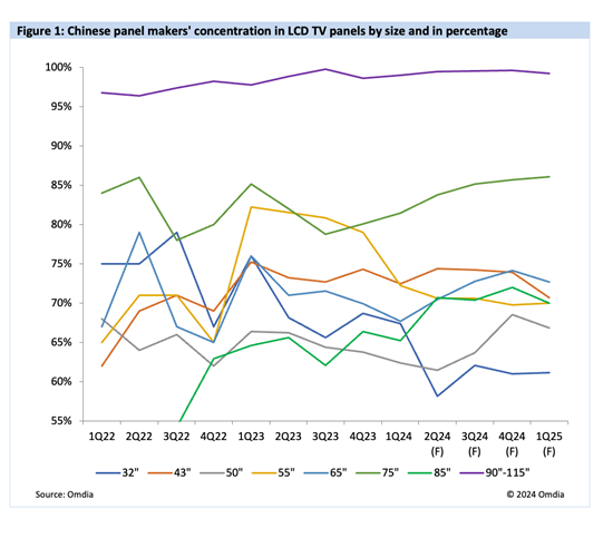 據研究機構Omdia報告,目前中國面板制造商正領導全球大尺寸電視LCD(液晶)面板市場,包括京東方、TCL華星光電、HKC等正成為這一市場的主導者。這些公司占據65/75/85英寸液晶電視市場70%~85%份額,在超大尺寸(90~115英寸)液晶電視市場中,幾乎占據100%份額。