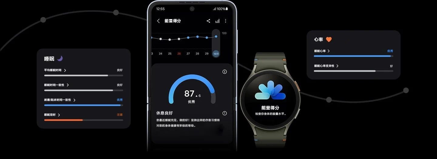 Galaxy AI 賦能下,Galaxy Watch7 智能手表新增能量得分功能,可幫助用戶更好地了解身體狀況,以科學(xué)合理的方式開始新的一天。Galaxy Watch7 還支持語音轉(zhuǎn)文字功能,可即時生成摘要,還支持還心率警示、ECG、身體成分測量、生理周期記錄、摔倒檢測等健康功能。