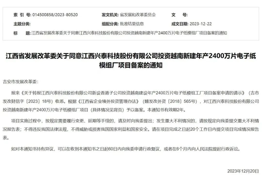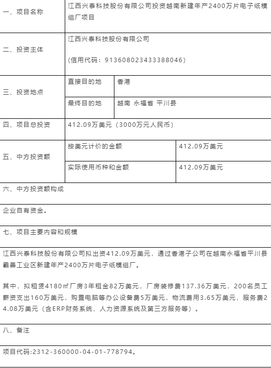 從吉安市發改委官網信息獲悉,2023年12月22日,江西省發展改革委對江西興泰科技股份有限公司投資越南新建年產2400萬片電子紙模組廠項目予以備案。通知顯示,江西興泰科技股份有限公司擬出資412.09萬美元,通過香港子公司在越南永福省平川縣霸善工業區新建年產2400萬片電子紙模組廠。
