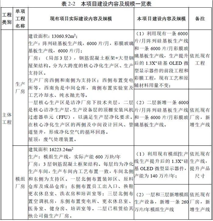 廠區(qū)現(xiàn)有工程包含已建成的“OLED 微型顯示器件項(xiàng)目”和“OLED 微型顯示器件項(xiàng)目配套基礎(chǔ)設(shè)施擴(kuò)建項(xiàng)目”,設(shè)計(jì)規(guī)模為 2000 萬(wàn)塊/年硅基顯示模組,產(chǎn)品規(guī)格為 0.2X"、0.3X"、0.4X"和 1.0X"。