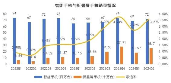 折疊屏憑借更大幅的創(chuàng)新、更新鮮的產(chǎn)品體驗成為高端手機市場發(fā)展的主要趨勢,華為發(fā)布的全球首款三折疊手機更是引爆市場。2022-2024年在疲軟的手機市場中,折疊屏手機市場表現(xiàn)亮眼,出貨量整體保持高速增長,未來隨著品類滲透逐漸提升,折疊屏手機有望成為高端市場的中堅力量。