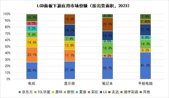 京東方在各應(yīng)用領(lǐng)域均均處于領(lǐng)先地位,TCL華星在電視和顯示器市場相對領(lǐng)先,LG在顯示器、筆記本和平板電腦領(lǐng)域有一定市場份額,群創(chuàng)在筆記本和平板電腦領(lǐng)域占據(jù)一定市場份額,友達則在顯示器和筆記本領(lǐng)域相對領(lǐng)先。