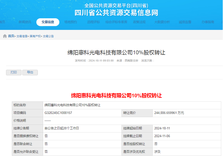 10月11日消息,據四川省公共資源交易信息網消息,綿陽惠科光電科技有限公司(以下簡稱:綿陽惠科)擬以底價約24.4億元轉讓10%股權。轉讓方為綿陽市投資控股(集團)有限公司(以下簡稱:綿陽投資)。