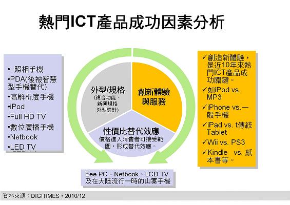 2000至2010年成功的ICT產(chǎn)品,黃銘章分析,其成功因素可分為外型/規(guī)格、性價(jià)比替代效應(yīng)以及創(chuàng)造新體驗(yàn)與服務(wù)3大類。規(guī)格提升是塑造產(chǎn)品差異化的最主要方式,諸如采用低溫多晶硅TFT LCD面板的PDA或高分辨率手機(jī)、講求超薄時(shí)尚的LED TV均是;而創(chuàng)造創(chuàng)新體驗(yàn)或服務(wù),則是建立長(zhǎng)期市場(chǎng)成功的關(guān)鍵方向,例如iPhone相對(duì)于一般手機(jī)、電子紙相對(duì)于傳統(tǒng)紙張等。