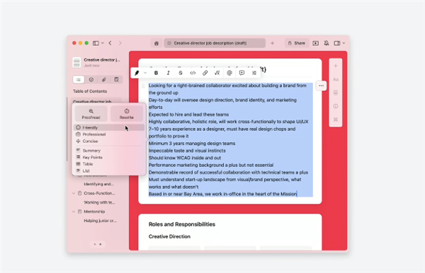 除此之外,還能一鍵總結(jié)歸納、對文本進行校對,和針對用詞和文本結(jié)構(gòu)提出建議。