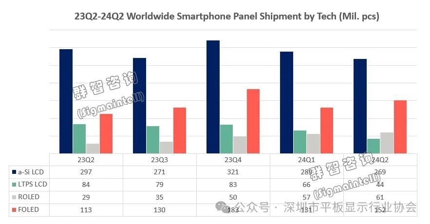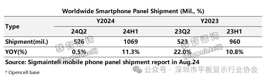 2024年上半年全球智能手機智能面板出貨約10.7億片(Open Cell口徑),同比增長約11.3%,其中二季度出貨約5.3億片。