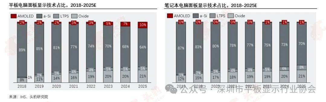目前,a-Si薄膜晶體管液晶顯示屏的表現(xiàn)足以滿足筆記本電腦和平板電腦的需求,因此成為這類設備面板的主流產品。IGZO薄膜晶體管液晶顯示屏在中大尺寸面板上具有更大優(yōu)勢,預計其在筆記本電腦和平板電腦面板市場的份額將逐步增加,占據(jù)主要高端市場。AMOLED和LTPS薄膜晶體管液晶顯示屏整體滲透率仍然不高,預計到2025年在平板與筆記本電腦產品滲透率分別為10%與1%。