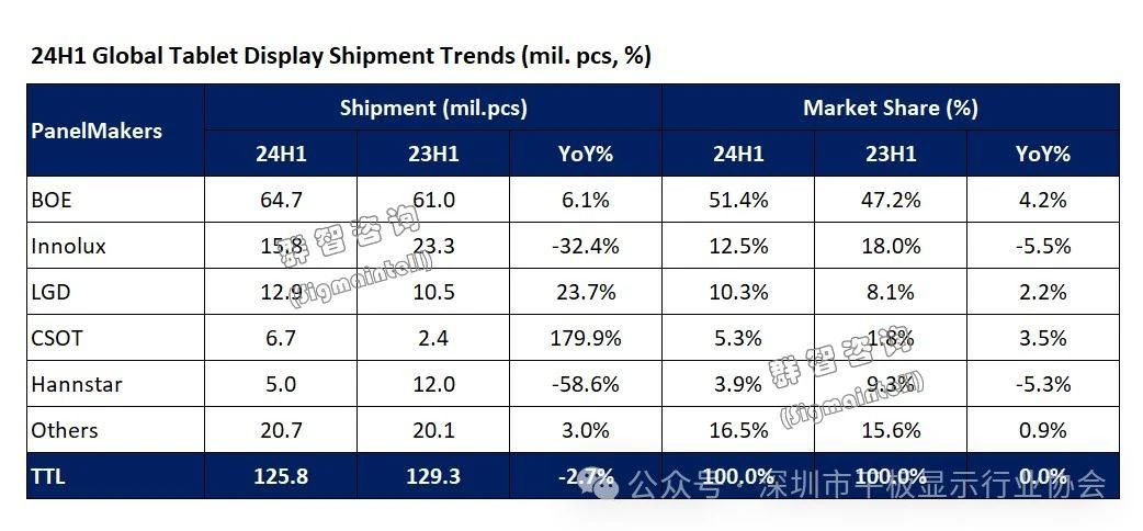 2024年上半年全球平板電腦面板市場出貨1.26億片,同比下降約2.7%。