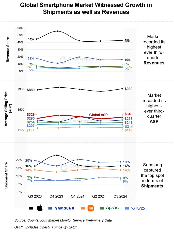 Counterpoint Research指出,雖然最近幾個(gè)季度的出貨量增長(zhǎng)有所放緩,但全球智能手機(jī)營(yíng)收增長(zhǎng)在2024年第三季度加速,同比增長(zhǎng)10%,達(dá)到歷史最高的第三季度水平。