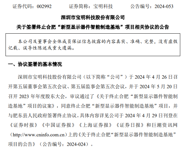 公告顯示,公司于2024年4月26日召開第五屆董事會第五次會議、第五屆監事會第五次會議,并于2024年5月20日召開2023年年度股東大會,審議通過了《關于終止合肥“新型顯示器件智能制造基地”項目的議案》,同意終止合肥“新型顯示器件智能制造基地”項目,并與肥東縣人民政府簽署終止協議。